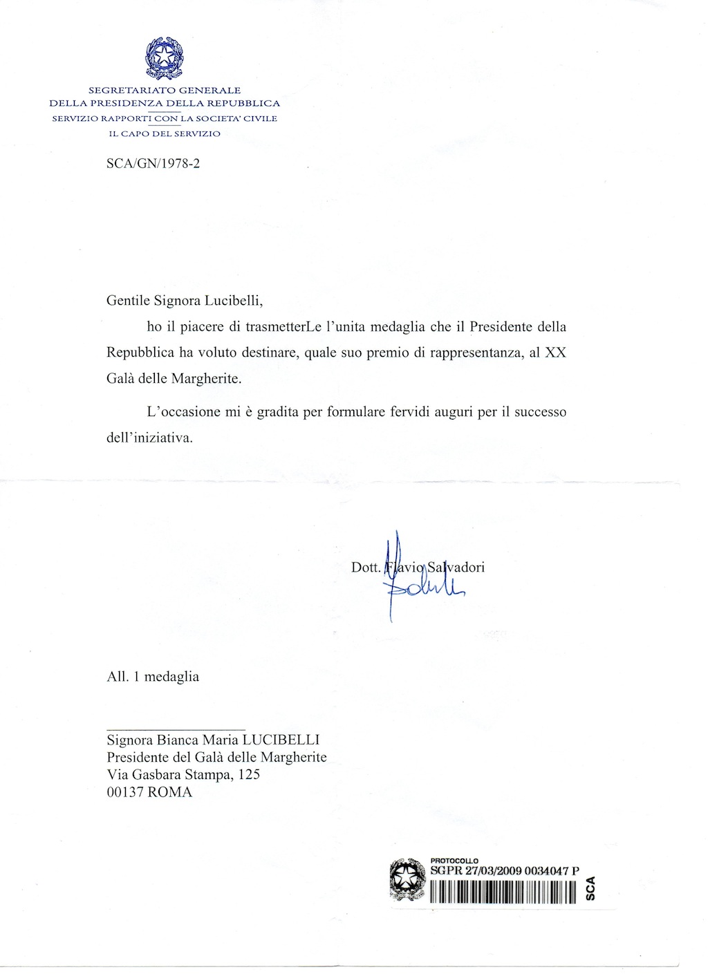 Riconoscimento del Presidente della Repubblica Italiana alla persona di Biancamaria Caringi Lucibelli.